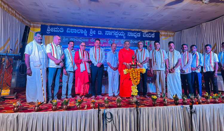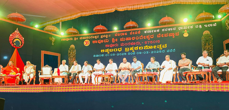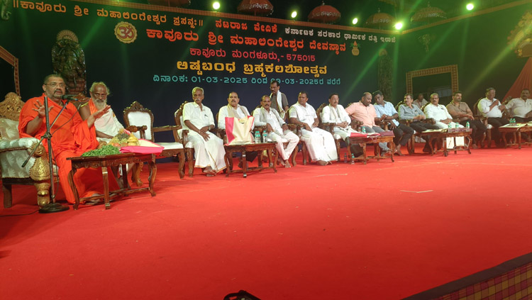 ಕಾವೂರು ಶ್ರೀ ಮಹಾಲಿಂಗೇಶ್ವರ ದೇವಸ್ಥಾನದ ಅಷ್ಟ ಬಂಧ ಬ್ರಹ್ಮಕಲಶೋತ್ಸವದ ಧಾರ್ಮಿಕ ಸಭೆಯ ಕಾರ್ಯಕ್ರಮದಲ್ಲಿ ಪೂಜ್ಯ ಶ್ರೀ ಡಾ. ಧರ್ಮಪಾಲನಾಥ ಸ್ವಾಮೀಜಿಯವರು 8 -3-25 ರಂದು ಸಂಜೆ ಭಾಗವಹಿಸಿ ಆಶಿರ್ವಚನ ನೀಡಿದರು. ವೇದಿಕೆಯಲ್ಲಿ ಗಣ್ಯರಾದ ಶ್ರೀ ಅಜಿತಕುಮಾರ ರೈ ಮಾಲಾಡಿ ಸಹಿತ ಅನೇಕ ಗಣ್ಯರು ಭಾಗವಹಿಸಿದ್ದರು.